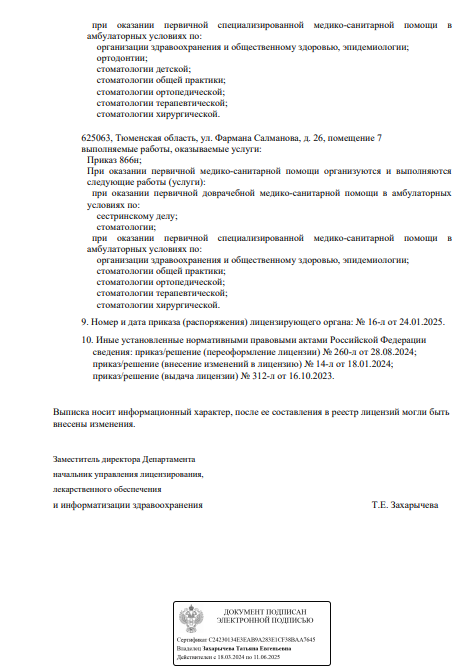 Предоставляет следующие услуги: восстановление зубной эмали и формы зубов, реставрацию зубов, молочных зубов, эстетическую реставрацию, специализируется на терапевтической стоматологии, лечении кист зубов и др.